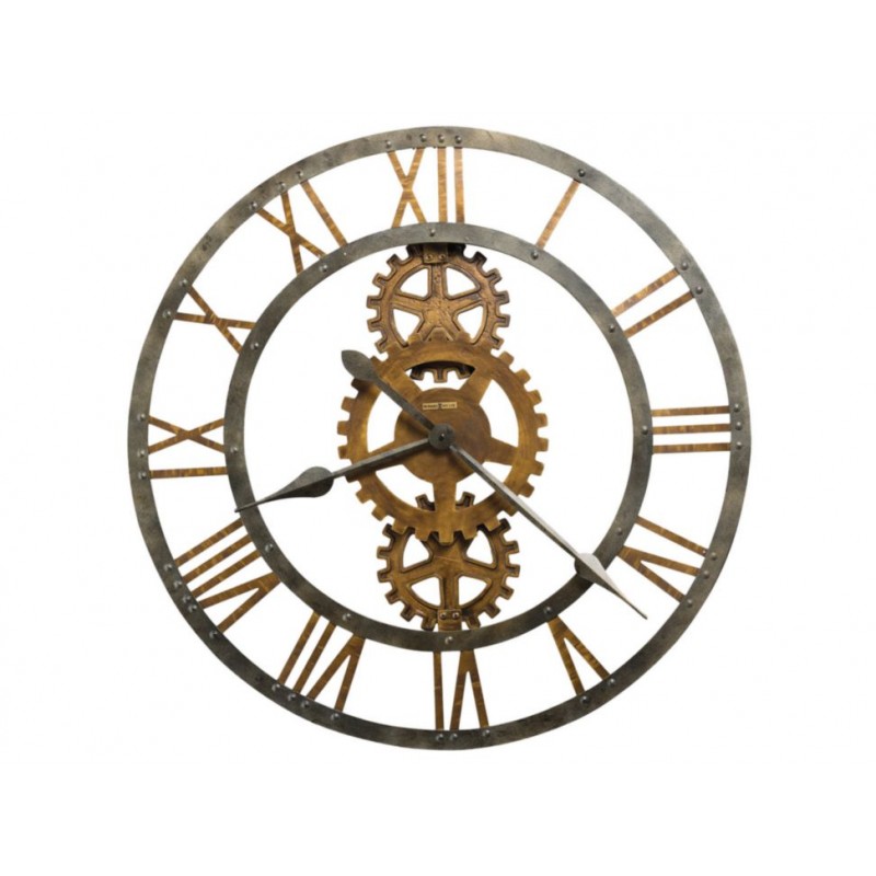 Atractivo reloj, muestra un engranaje en el centro de latón con acabado antiguo, números romanos dorados y manecillas en color gris, detalles decorativos en el marco del reloj